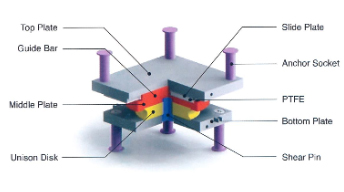 상부구조물의 수직하중, 신축이동 및 회전변위는 특수 설계된 디스크 베어링(Disc Bearing)에 의해 수용된다. 지진하중 작용시 PTFE와 Stainless Steel판의 Sliding에 의한 기초 분리 및 마찰저항을 하고, 동시에 매스에너지조절장치(Mass Energy Regulator)의 압축강성으로 변위를 적당히 조절하여 지진하중을 흡수, 소산시킨다.