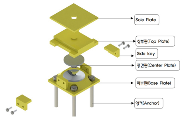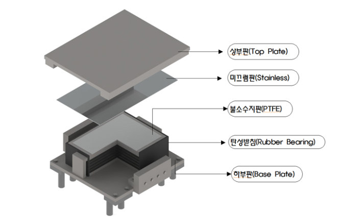 즉, 상부구조 거동시 마찰력에 의한 탄성받침의 전단변형이 발생할 경우, 마찰력에 의한 감쇄를 기대하기 어렵기 때문에 탄성받침의 내부 또는 측면에 전단변형 방지 장치(STOPPER)를 설치하여, 탄성받침의 전단변형이 아닌 마찰면의 미끄럼 발생으로 인한 마찰 감쇄를 유도하는 것이다.