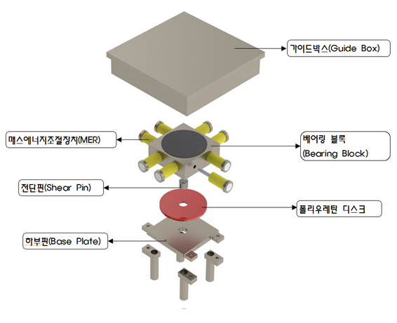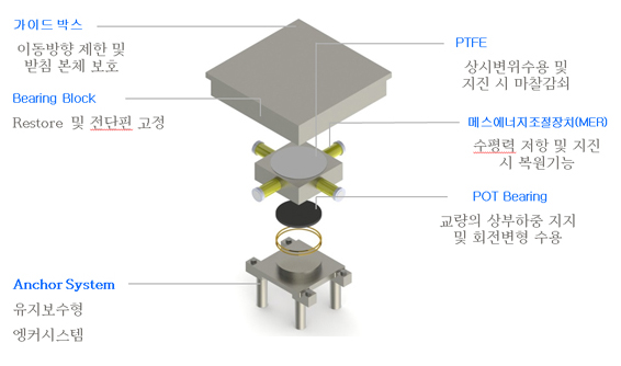 지진시 수평력이 어느 방향으로 작용되더라도 교량 상부와 하부구 조물 사이에서 상호분리(Base bolation)가 될 수 있도록 설계된 디스 크받침(Disk Bearing)과 지진시 작용되는 수평하중을 적당한 압축변 형에 의한 강성으로 저항하여 구조적 안정성을 확보하는 메스에너지 조절장치(Mass Energy Regulator, MER)가 서로 조합되어 지진력을 흡수 소산시키는 면진장치이다.